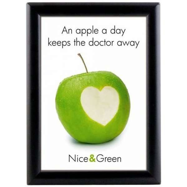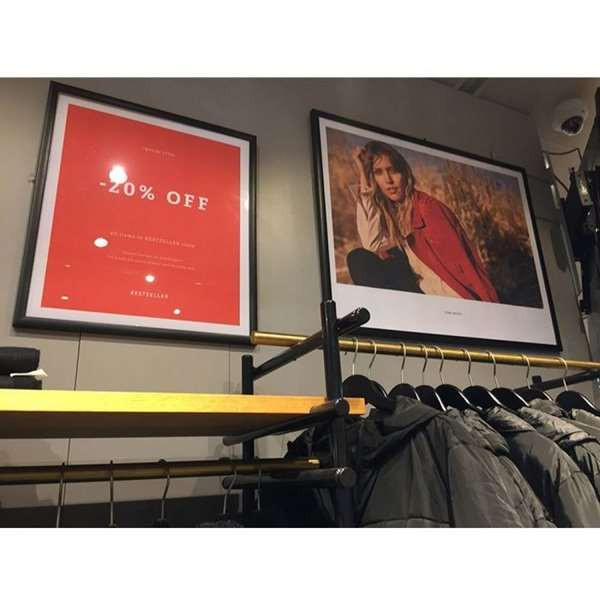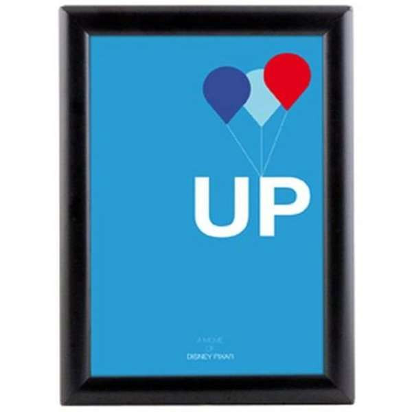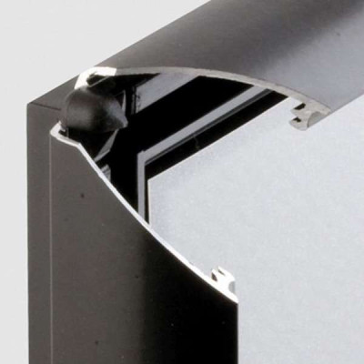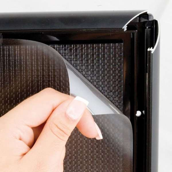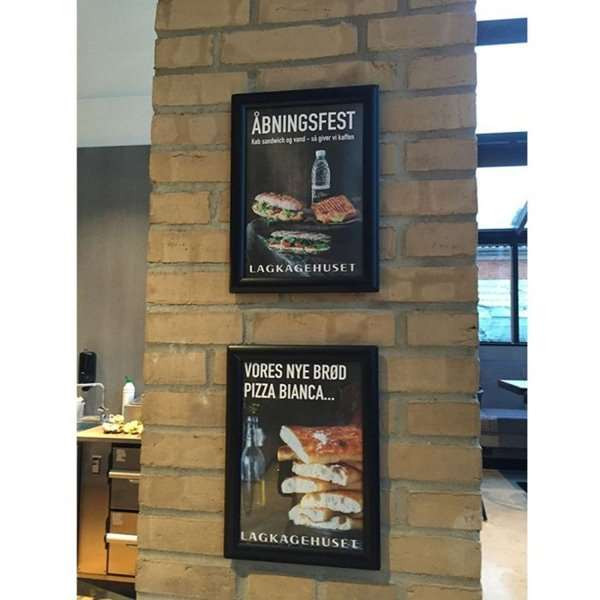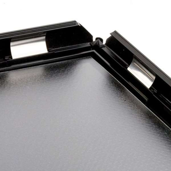 Meget konkurrencedygtig klapramme med 25 mm sort, pulverlakeret RAL9005 aluminium profil. Hjørner i gering. Formstøbt bagplade i grå eller sort polystyren. APET antirefleks frontplade. Inklusiv skruer og plugs til montering.