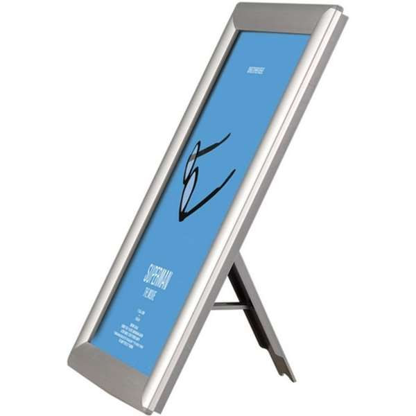 Meget konkurrencedygtig klapramme i sølv med bagstøtte til A4 print. Topprofil i eloxeret aluminium med hjørner i gering. Formstøbt bagplade i grå polystyren. APET antirefleks frontplade. Inklusiv bagstøtte til vertikal eller horisontal placering. Kan også hænges på væg.