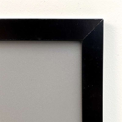 Klapramme pulverlakeret i sort / RAL 9005med 20 mm flad profil med hjørner i gering. 1,5mm PS bagplade og APET antirefleks frontplade.Inkl. skruer og plugs. Antal pr. karton: A5 20 stk. -A4 10 stk. - A3 og størrere 5 stk.