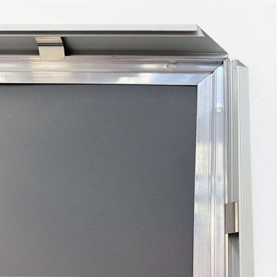 Sølveloxeret aluminium klapramme. 20 mm flad profil med hjørner i gering. 1,5 m PS bagplade og APET antirefleks frontplade. Inkl. skruer og plugs.