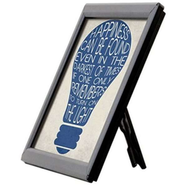 Meget konkurrencedygtig sort A6 klapramme med bagstøtte. Topprofil i sort aluminium med hjørner i gering. Formstøbt bagplade i grå polystyren. APET anti- refleks frontplade. Inklusiv bagstøtte til vertikal eller horisontal placering. Kan også hænges på væg.Kan leveres i A6, A5 og A4 størrelse.