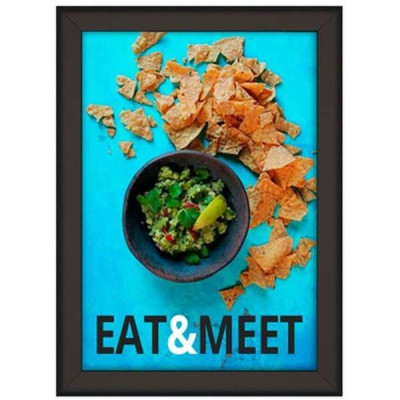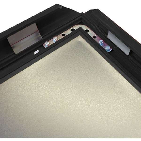 Sortlakeret 50 x 70 cm klapramme med 32 mm profil og hjørner i gering. 1,5 mm PS bagplade samt APET antirefleks frontplade. Inklusiv skruer og plugs til montering.