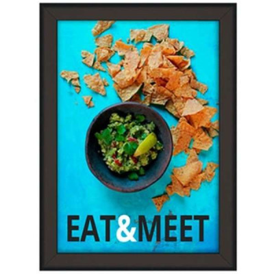 Sortlakeret A3 klapramme med 32 mm profil og hjørner i gering. 1,5 mm PS bagplade samt APET antirefleks frontplade. Inklusiv skruer og plugs til montering.