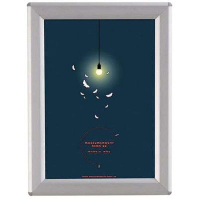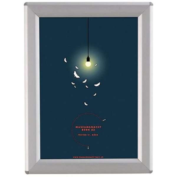 Meget konkurrencedygtig klapramme i sølveloxeret aluminium. 14 mm profil med hjørner i gering. Formstøbt bagplade i grå eller sort polystyren. APET antirefleks frontplade.