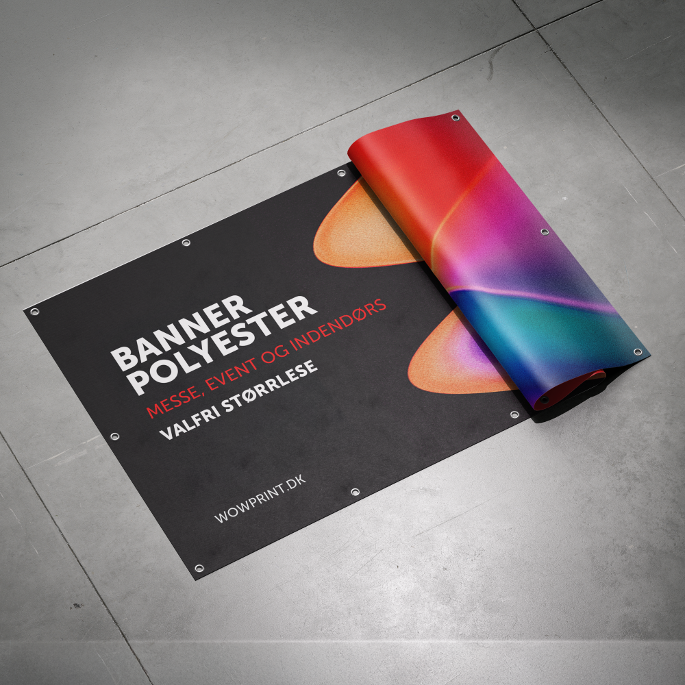Hos WOWprint tilbyder vi bannere med tryk i høj kvalitet på brandhæmmende polyester, som er ideelle til messestande, konferencer, udstillinger og kampagnebrug indendørs. Polyesterbannere er lette, nemme at transportere og monteres hurtigt – uden at gå på kompromis med det professionelle udtryk.